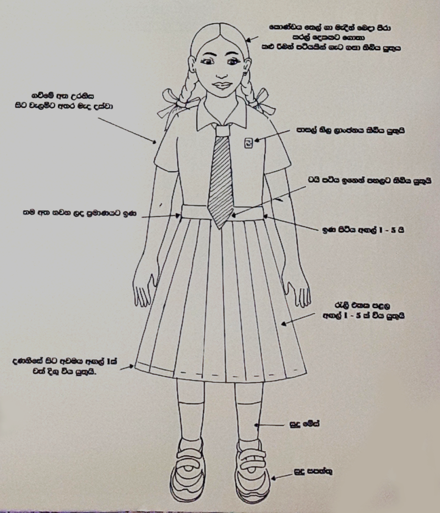 - කොණ්ඩය ගැට ගැසූ පසු රිබන් පටිය එල්ලෙන සේ තිබිය යුතුය.